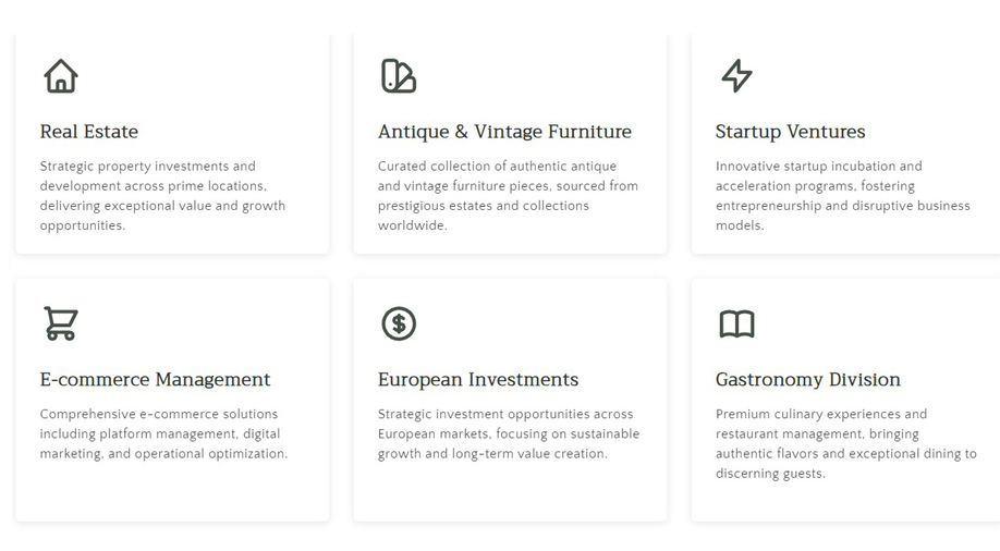 management, real estate investments, mini-markets and hospitality properties, antique and